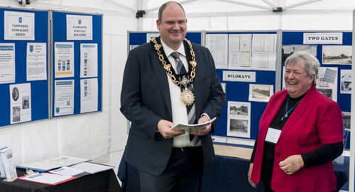 Tamworth Heritage Magazine joined with the Tamworth Genealogy Group and Tamworth History Group at Wilnecote Fun Day organised by Cllr Tina Clements. In the Photo is the Genealogy Group Chair, Jill Gadsby talking to the Mayor Gareth Coates